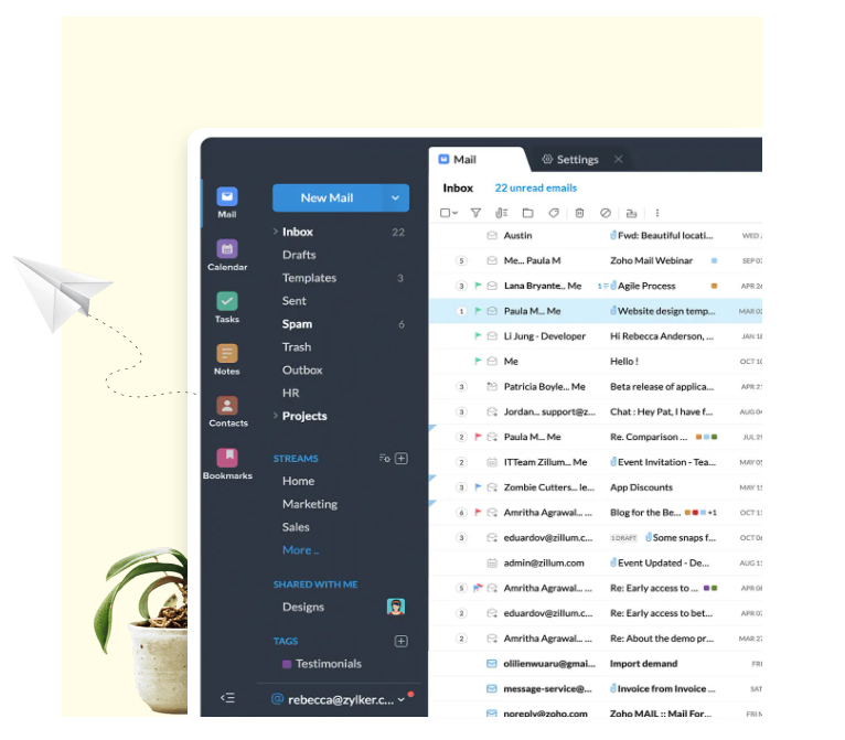 It's more than a mailbox. With custom mail, say goodbye to endless reply chains; just tag colleagues to share emails with them. Stay one step ahead with built-in applications like Calendar, Tasks, Notes, Bookmarks, and Contacts—all accessible from your mailbox.